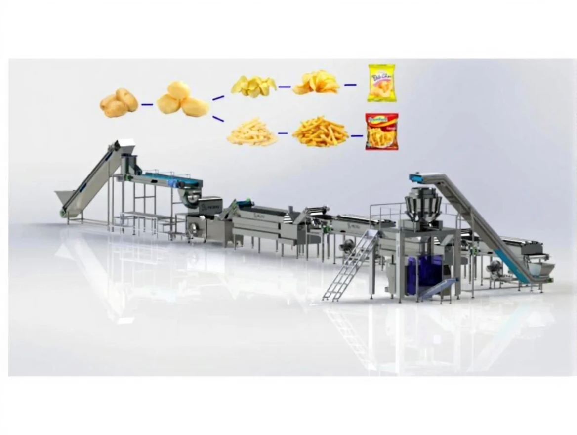 The system is fully automatic and fed without any manual touch, the potatoes are washed and peeled with minimal waste. Peeled potatoes are sent to the sorting conveyor after washing. The potatoes, which have moved on to the cutting section, are cut into the desired shape and size, and then the starch is removed. The potatoes with starch removed are cooled with the help of air after the frying unit, packaged and made ready to use.