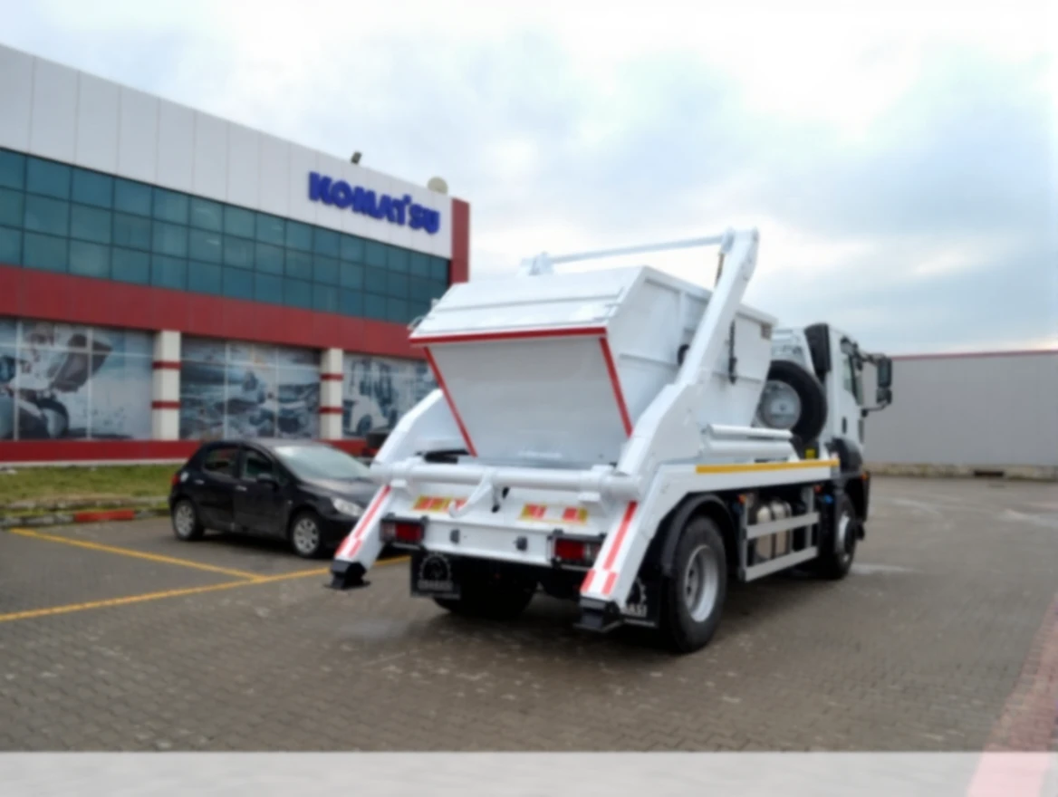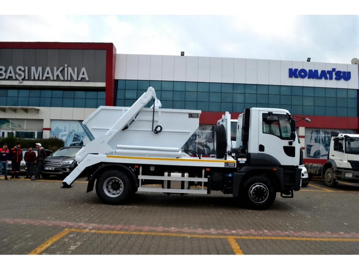 It can lift special designed containers on the ground, 4-6m3, parallel to the ground and can pick them up on it, it can also empty this container with the help of a hook on the system.