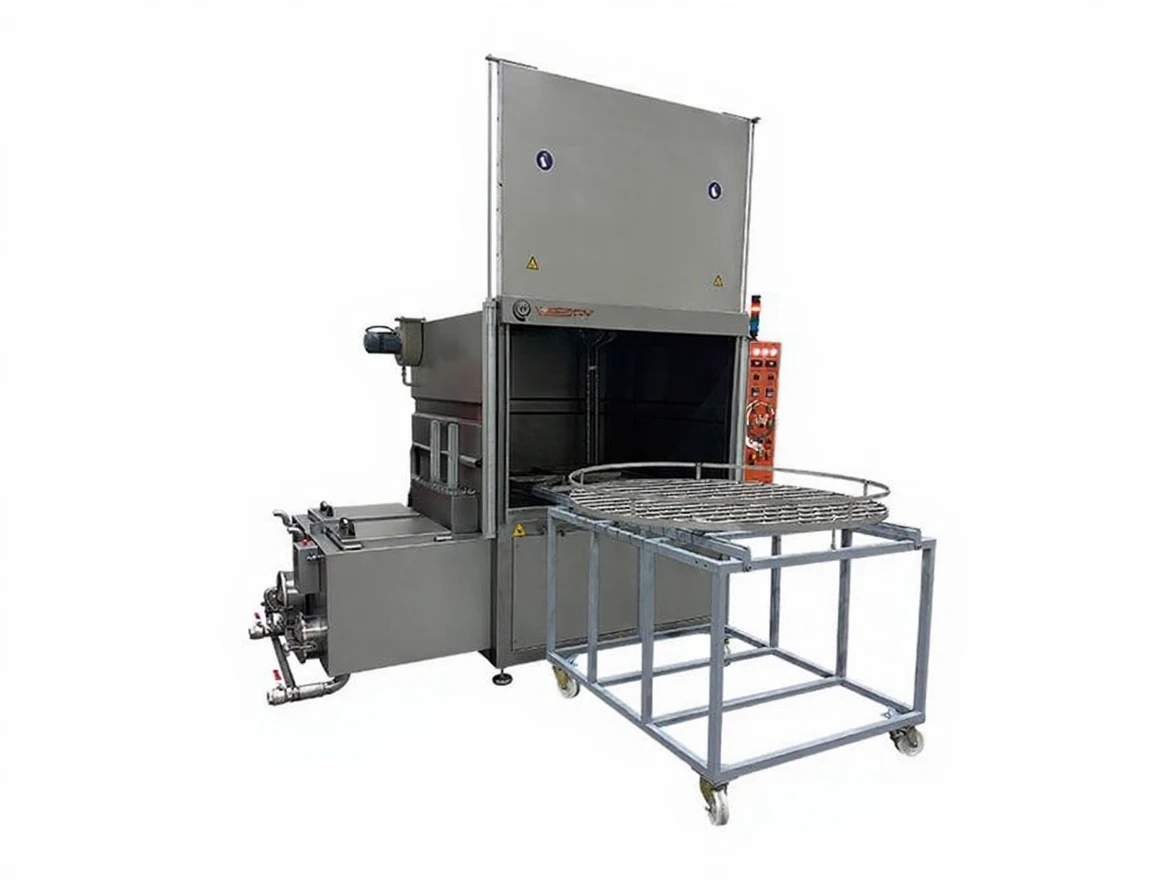 The basket, placed on a stainless steel rotating platform with a sliding system, is subjected to washing, rinsing, and drying with high-pressure detergent and water in a closed chamber where the parts to be washed are placed.