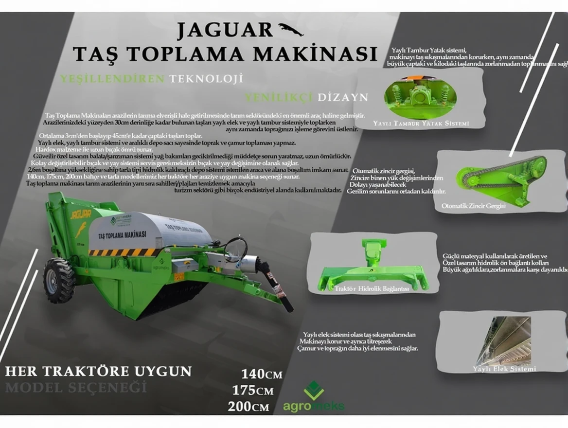 The Agromeks 140cm Stone Collecting Machine plays a significant role in making stony lands suitable for agriculture. This machine effectively collects stones in agricultural fields, facilitating soil processing and reducing labor in challenging stony areas. Additionally, it is highly suitable for industrial uses outside agricultural areas. It can also be used in various fields such as beach cleaning and the tourism sector.