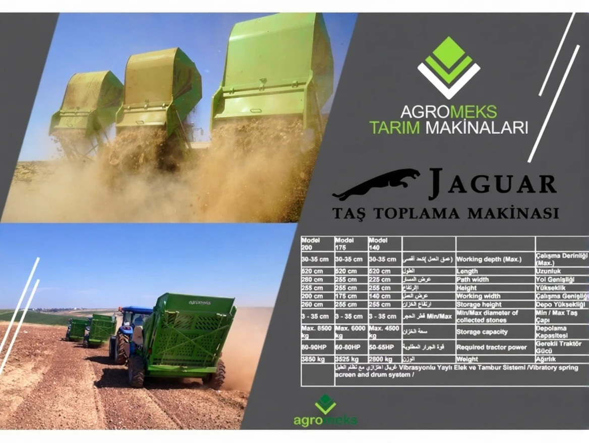 The Agromeks 140cm Stone Collecting Machine attracts attention with its user-friendly design, high performance, and durability. With a tractor power requirement of 50-65 HP, it can be easily used in small and medium-sized lands. Weighing 2800 kg, the machine completes stone collection tasks safely and quickly with its durable structure.