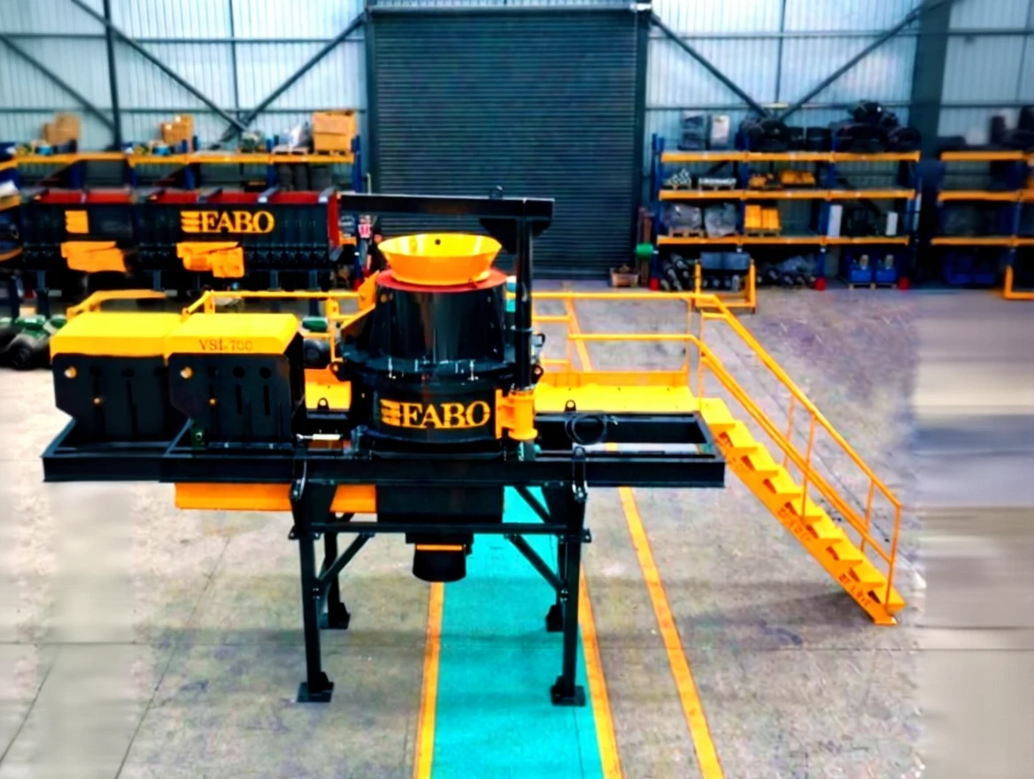 • Model: FABO VSI-700 • Type: Vertical Shaft Crusher • Capacity: 100-150 tph • Maximum Feed: 30 mm • Rotor Size: Ø 700 mm • Speed: 50-70 m/s • Motor: Heavy-duty GAMAK, 200 kW • Bearings: Heavy-duty SKF-FAG • Weight: 10000 kg • Dimensions: 4000 * 3000 * 2450 mm • Includes chassis, motor, and safety guards.