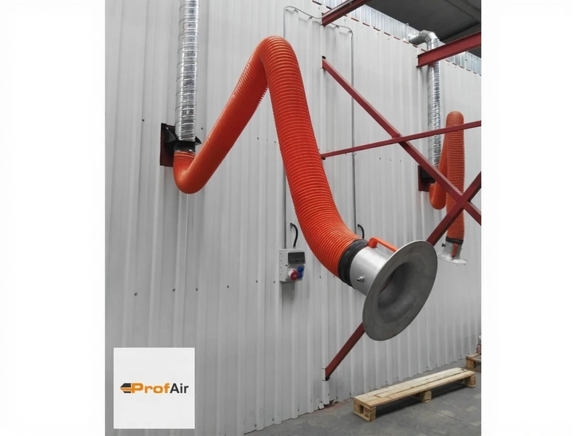 ProfAir F30T is a welding fume extractor with an Ø160mm diameter and a 3-meter long acrobat arm and installation bracket. It uses an inner jointed mechanism for laser cutting and is equipped with a TPU flex flame-retardant hose. It features a high-efficiency lightweight aluminum hood. Diameter options range from 160-200 mm and offer wall mounting options with air ducts.