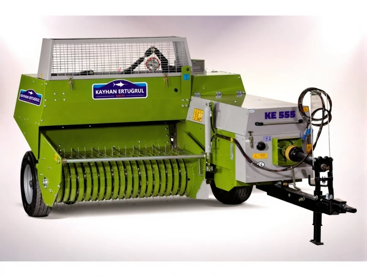 The KE 555 Baler machine picks up crops such as cut straw, clover, wheat, barley, and similar products from the ground, compresses them, wraps them with twine, and turns them into bales. It is the most common and useful machine that produces rectangular prism-shaped bales. Storing, transporting, and using these bales is very easy.