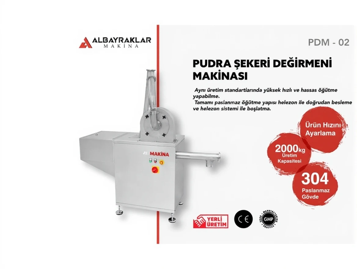 Albayrak Machine PDM-02 Powder Sugar Mill Machine, with its high capacity and fully automatic structure, transforms granulated sugar into powdered sugar of the desired grain size. This machine is an excellent solution for small and medium-sized enterprises.