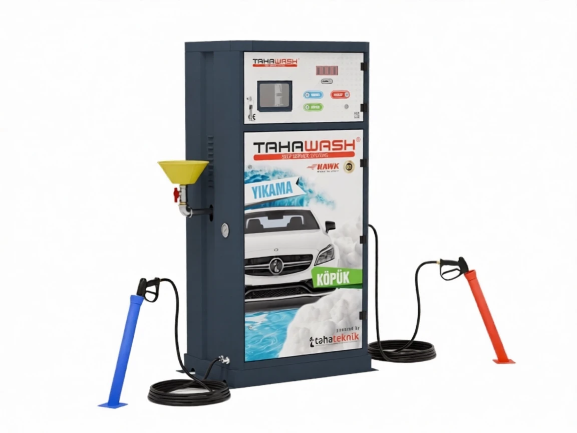Tahawash TTJX Token Car Wash + Foam Machine stands out with its separately designed mechanical and electrical components. Its body, made of electrostatic oven-painted sheet material, ensures durability and long-lasting use. The front and rear covers in the mechanical section facilitate intervention and maintenance processes, providing great practicality to the user.