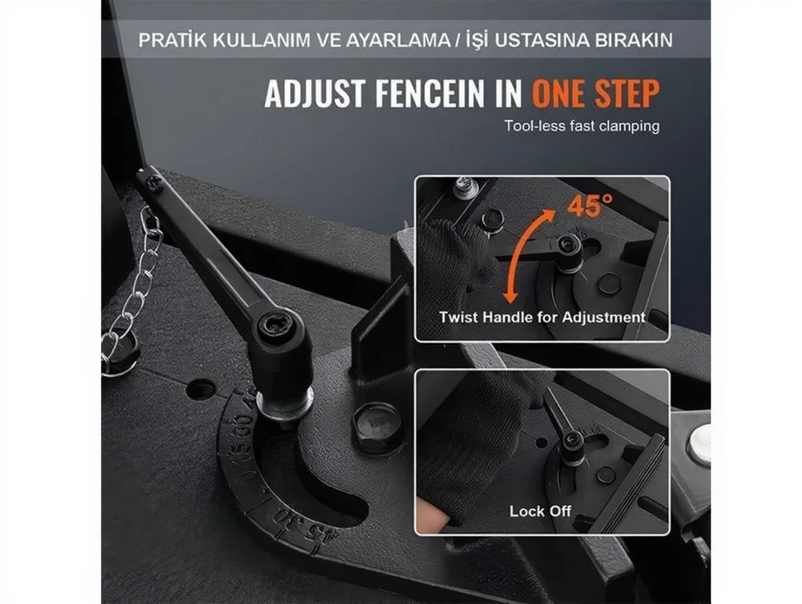 Compressive mechanism with quick release lock – can be used for angled cuts from -15 degrees to +45 degrees. Supplied with burr guard, hex key holder, transport support, and additional handle for transport.