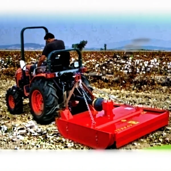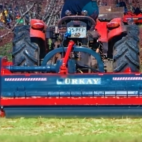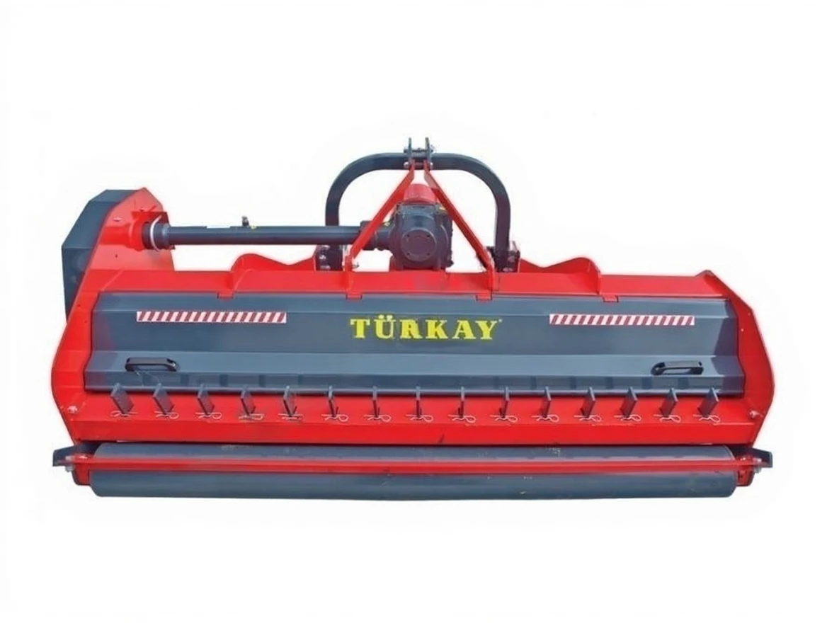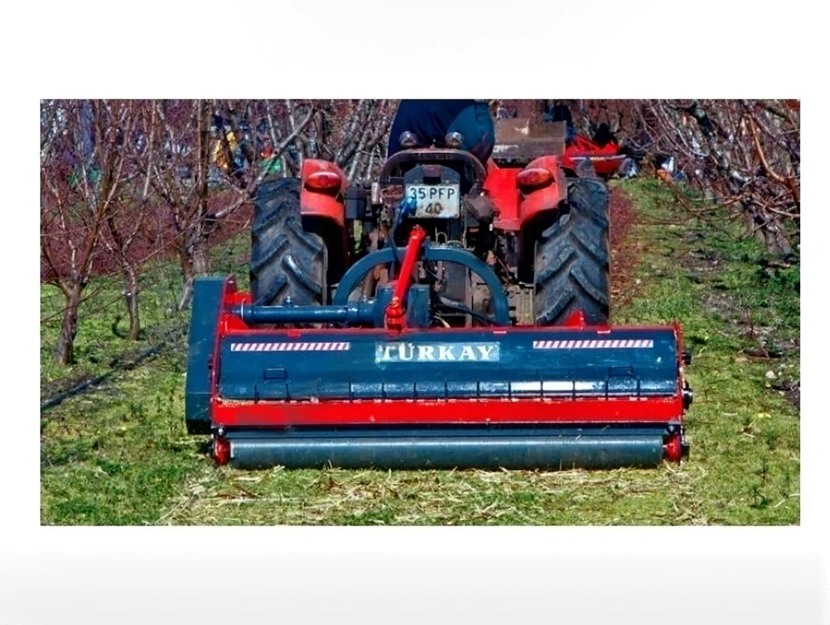 - The TURKAY-Vertical Blade Stalk Shredding Machine, which takes its movement from the tail shaft and connects to the tractor with a three-point hitch system, works by rotating vertically to the soil surface and is an important equipment that can maintain cutting height, blade durability, and balance precision even on uneven ground, thanks to its durable blades connected to the roller with a hinge, shredding plant stalks such as wheat, sunflower, cotton, corn, rice, tobacco, and shrubs, as well as pruned fruit tree branches and vine sticks, providing organic fertilizer recycling through the side skids and the roller behind it.