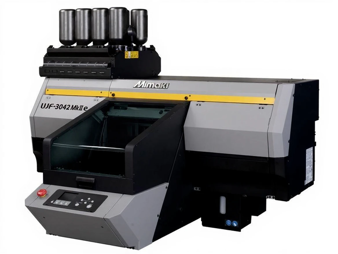 The Mimaki UJF-3042MkII e is a desktop UV-LED flatbed printer with an A3 size (300 x 420 mm) print area and media thickness up to 153 mm. This model enables direct printing on a variety of materials, offering improved image quality and machine stability.