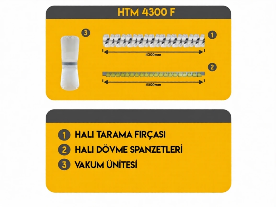 In addition to the standard HTM series carpet dusting machines, the HTM 4300 F series includes a 430 cm long brush roller at the front. This brush collects hair, fibers, and dust from the carpet before the dusting process, and also combs and fluffs the carpet fibers, separating tangled and crushed fibers. This allows dust and foreign objects to be cleaned much faster and more effectively during the beating process. It also facilitates the fluffing process of the carpet, ensuring the fibers are evenly placed.