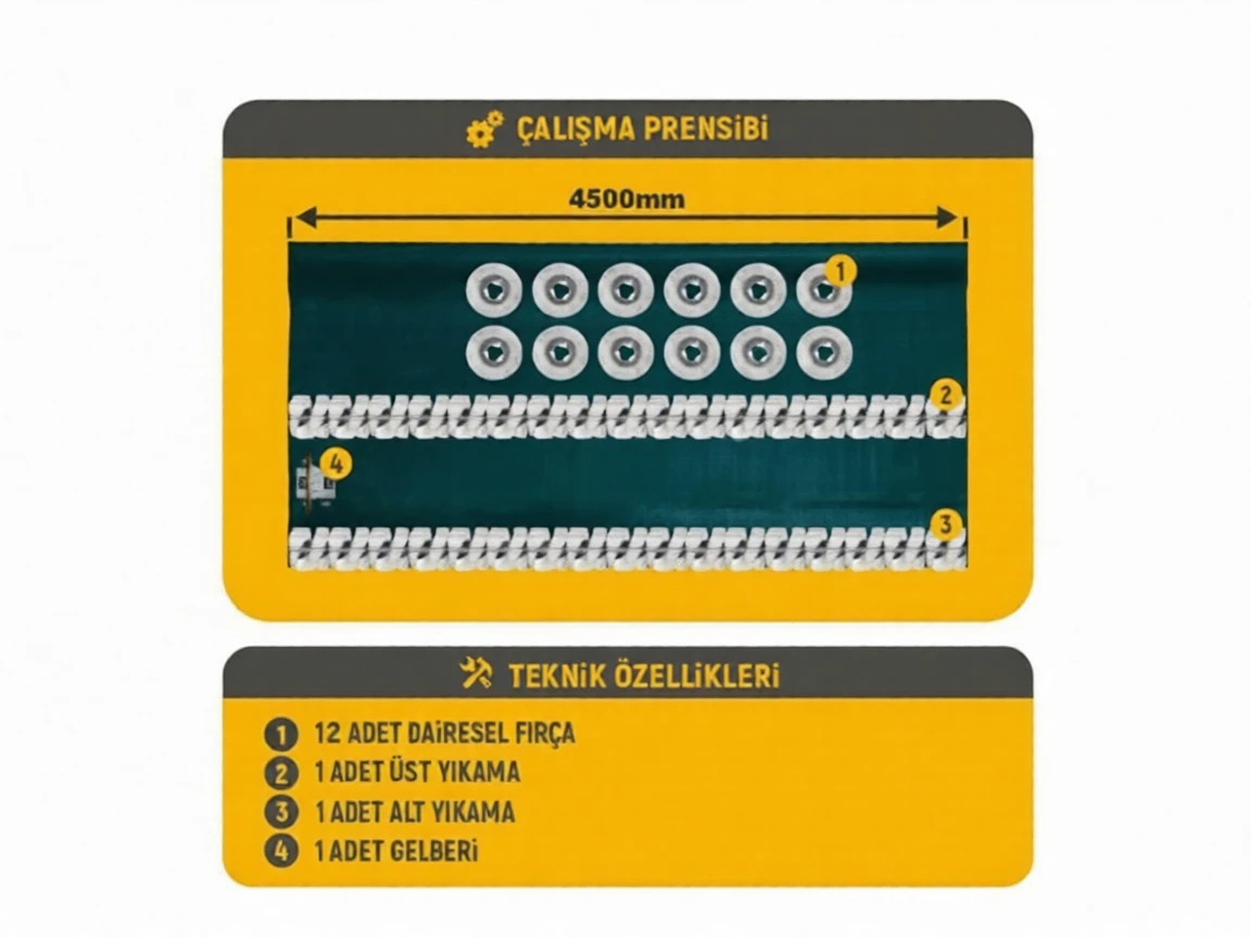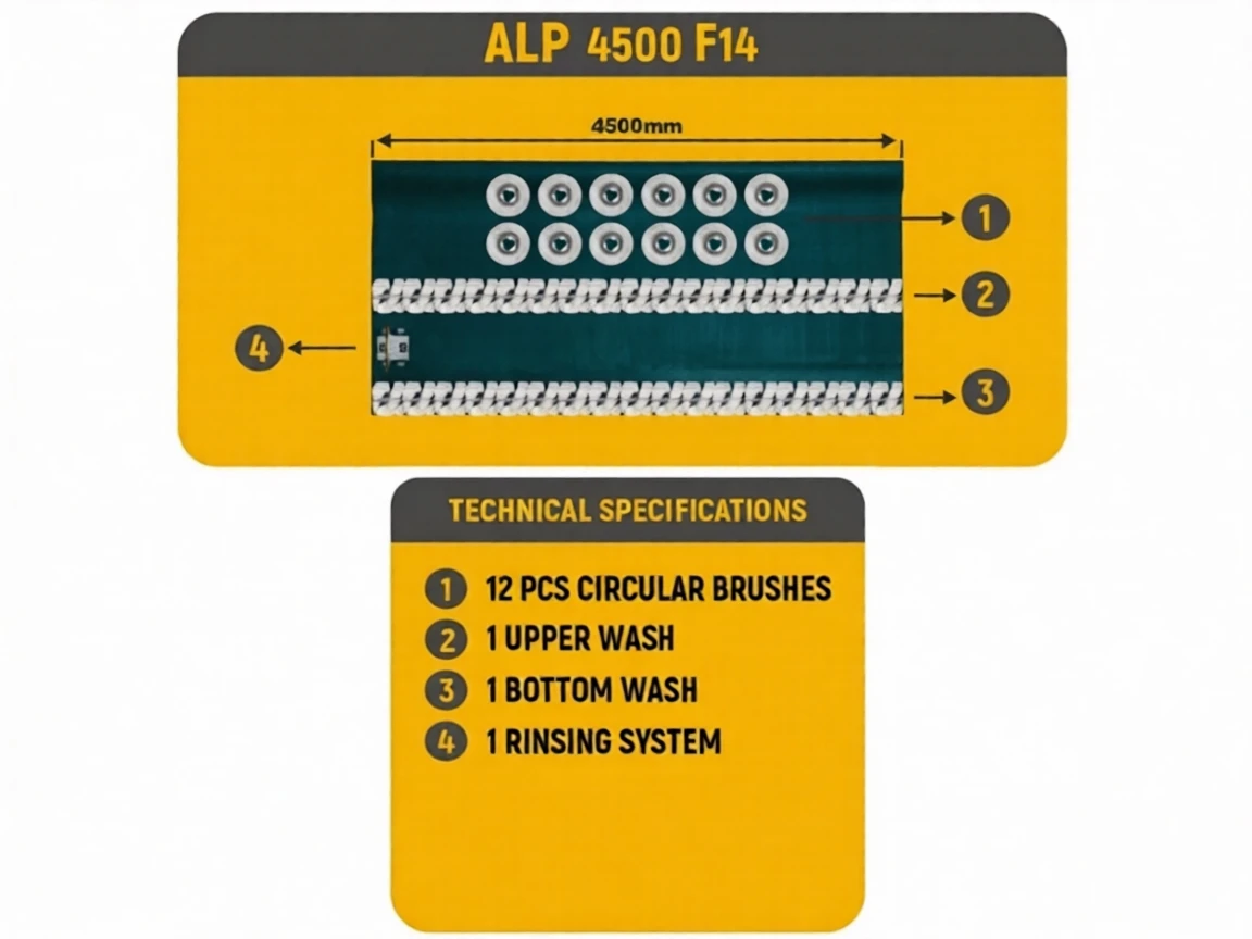 This model of 12-brush automatic carpet washing machine, ALP 4500 F14, with a daily carpet washing capacity of approximately 1500-2000 m², is a popular choice for carpet washing businesses. With a 450 cm belt width, this table-type machine is highly preferred by businesses with large washing needs.