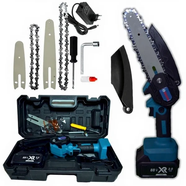 Accessories: 1 box, 1 pruning saw, 1 branch shear, 1 battery charger, 2 Li-ion Batteries, 1 chain, 1 machete, 2 meter telescopic extension, Additional Parts
