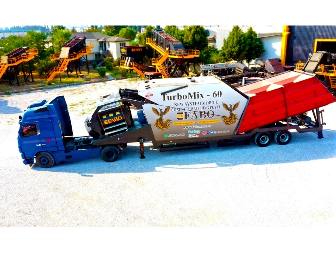 FABO TURBOMIX series mobile concrete plants have automatic control for aggregate materials and additives, static/dynamic Load Cell Weighing. Concrete plants have a high-capacity quality and powerful concrete mixer that provides a homogeneous mix.