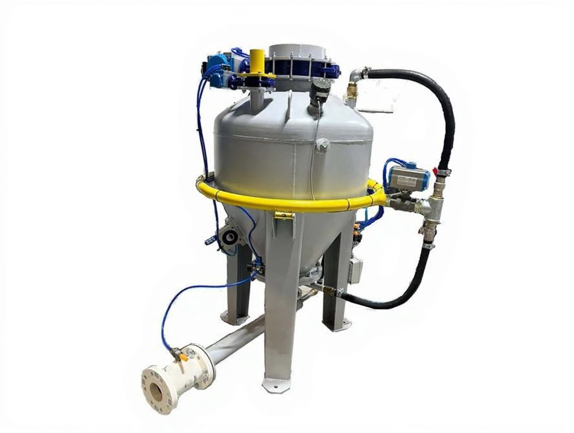 This system is a pneumatic conveying solution that transfers materials using high-pressure air with a capacity of 600 liters. When the material is taken into the system, the tank is pressurized, and once the set air pressure is reached, the outlet valve opens. This allows the material to be transferred quickly and safely through the pipeline.