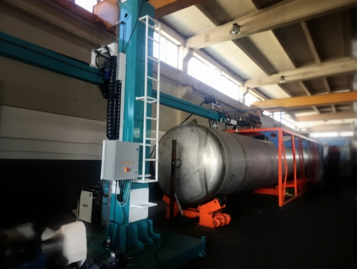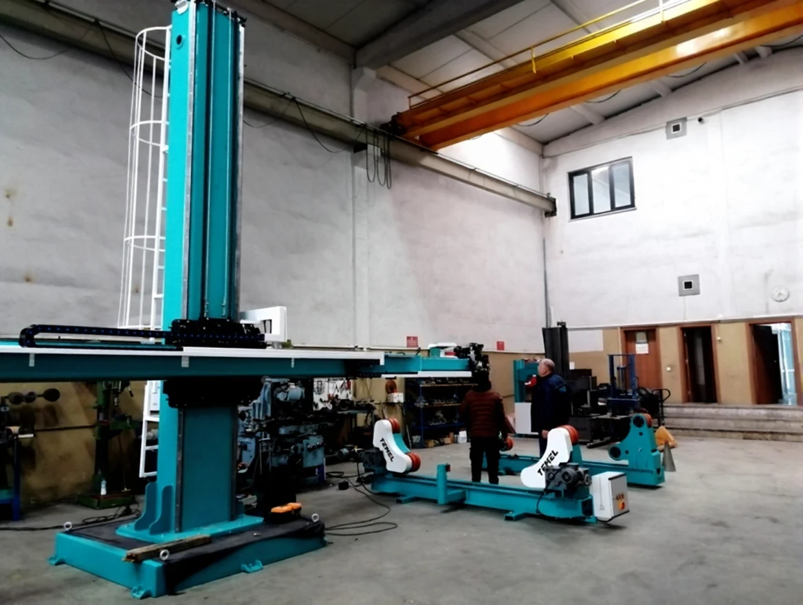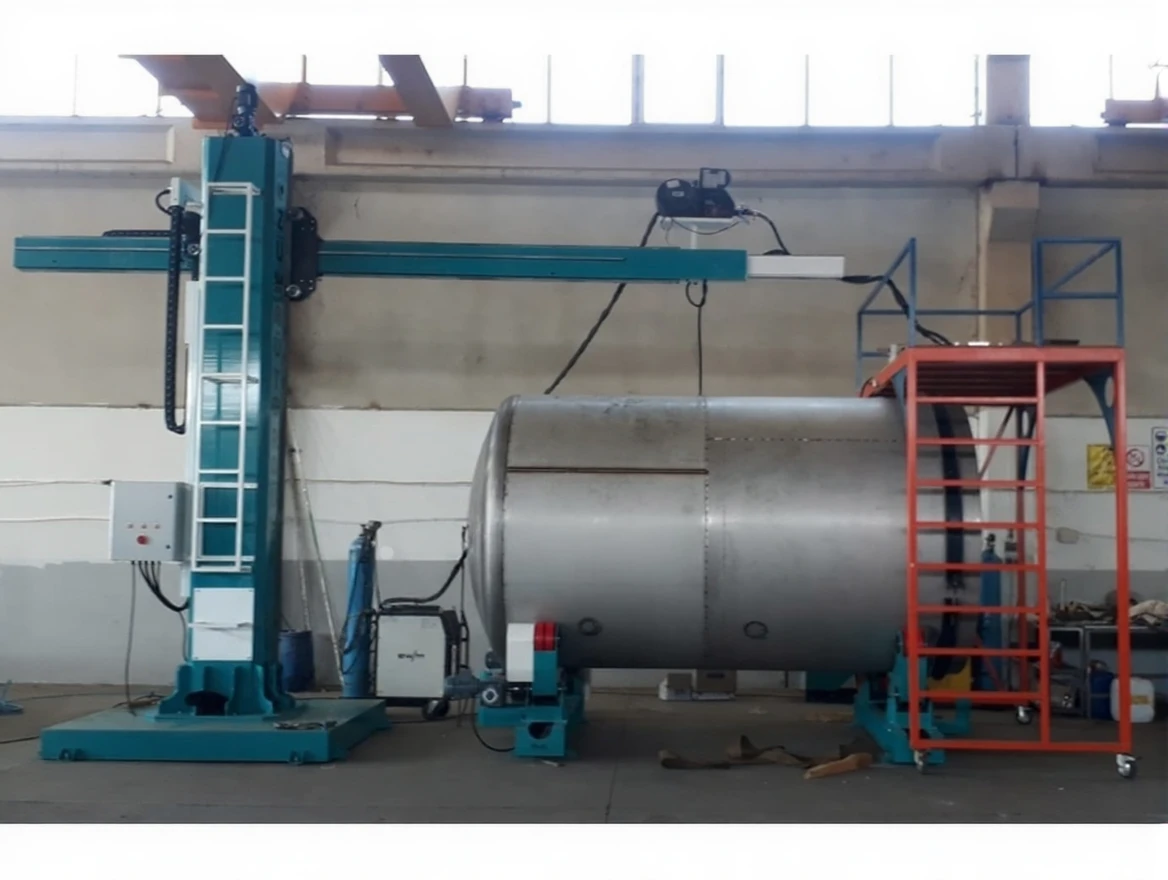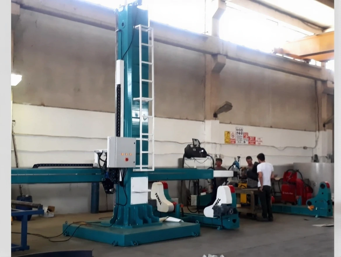 The column boom system is designed to perform longitudinal or circular welding on large diameter tanks and armored vehicles. The system, manufactured using special materials, allows the column to move upwards between 2 meters and 6 meters, while the boom can move sideways between 2 meters and 6 meters, enabling the welding of materials. The boom movement can also perform precise internal welds of cylindrical workpieces with linear slides and a telescopic boom.