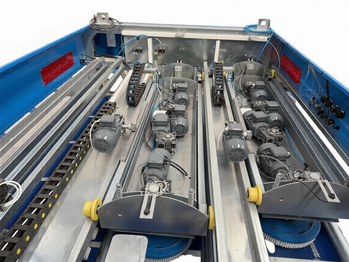 The machine provides effective cleaning by applying homogeneous pressure to the carpet surface with 8 pieces of 43 cm diameter disc brushes and 2 pieces of 270 cm roller brushes. The pneumatic pressure system automatically adapts to carpets of different thicknesses. The whole system is managed through PLC control to minimize human errors.