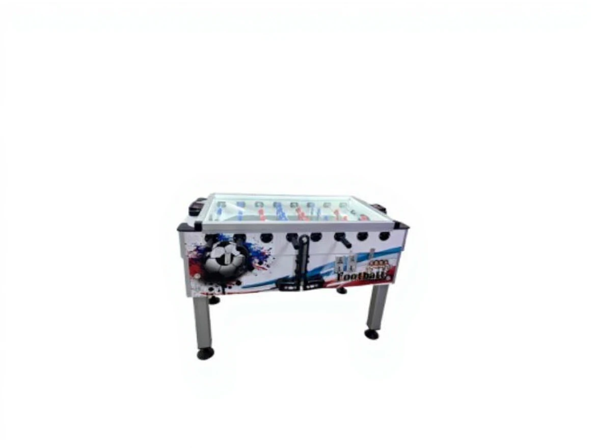 The exterior of the coated plywood foosball table cabinet is covered with a sticker. When the machine is idle, it plays Champions League demo music at regular intervals. Additionally, there is an option to cheer without scoring, depending on your preference. The upper cabinet is 24mm, the lower cabinet is 20mm, and it is covered with football patterned sticker on laminated plywood. The legs are 80mm x 80mm corrosion-resistant anodized aluminum profiles. The player rods are ST 52 18mm x 2 mm steel and are telescopic. They do not extend to the opponent’s side. There is a token box that can be locked inside the cabinet. The top of our machine is covered with 4mm tempered glass that is impact-resistant. There are two electronic coin recognition mechanisms. Indoor lighting is done with a strip LED that is in a non-distracting area during the game. A four-digit electronic token counter is located on the processor board. Thanks to the center apparatus located at the front of the cabinet, the balls do not go outside the foosball table. The processor board plays the fan music of selected teams FB, GS, BJK, and TS when a goal is scored and displays it on the score table.