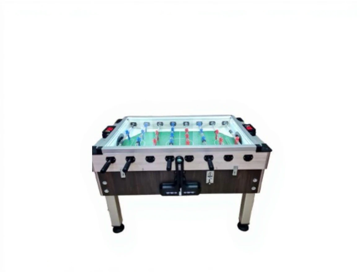 The commercial foosball table has a digital display.