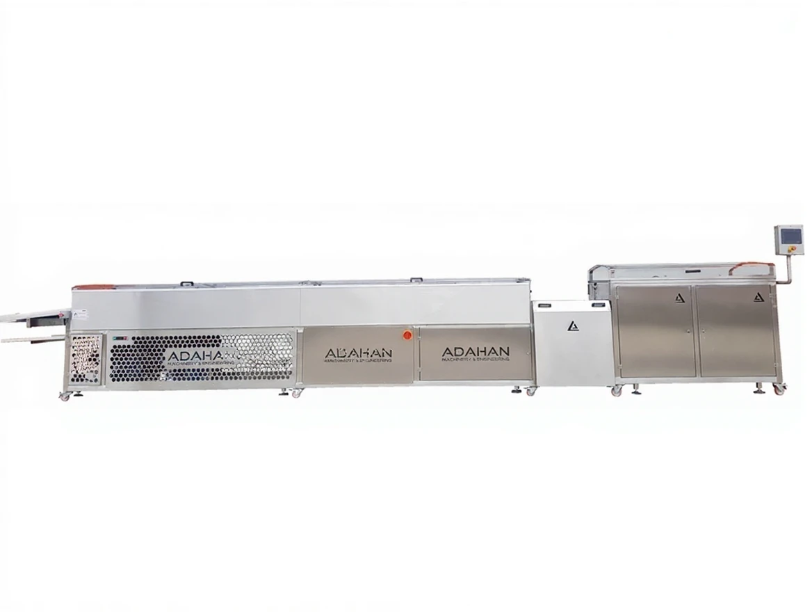 The decorative machine chocolate coating machine designed by Adahan Makina for industrial chocolate production is made of high-quality AISI 304 stainless steel. It consists of two sections: chocolate coating and cooling tunnel, and has various features.