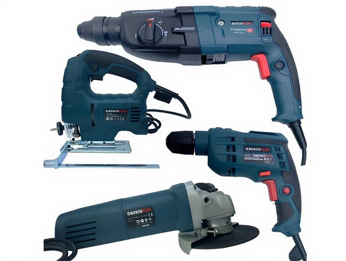 Boschplus electric four-piece set with screwdriver, breaker drill hilti, jigsaw and palm grinder with bag