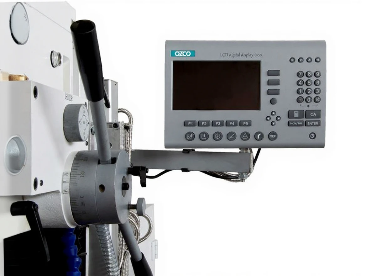 Variable speed adjustment (stepless) digital speed indicator, Heavy cast iron body, Powerful motor, X-axis electric motor – automatic, Z-axis electric motor – automatic, LCD digital display 3-axis coordinate reader, Guide pull mode, Height-adjustable safety switch guard, Cooling system, Lighting, Control panel, Machine-mounted steel table, Compliance with CE standards