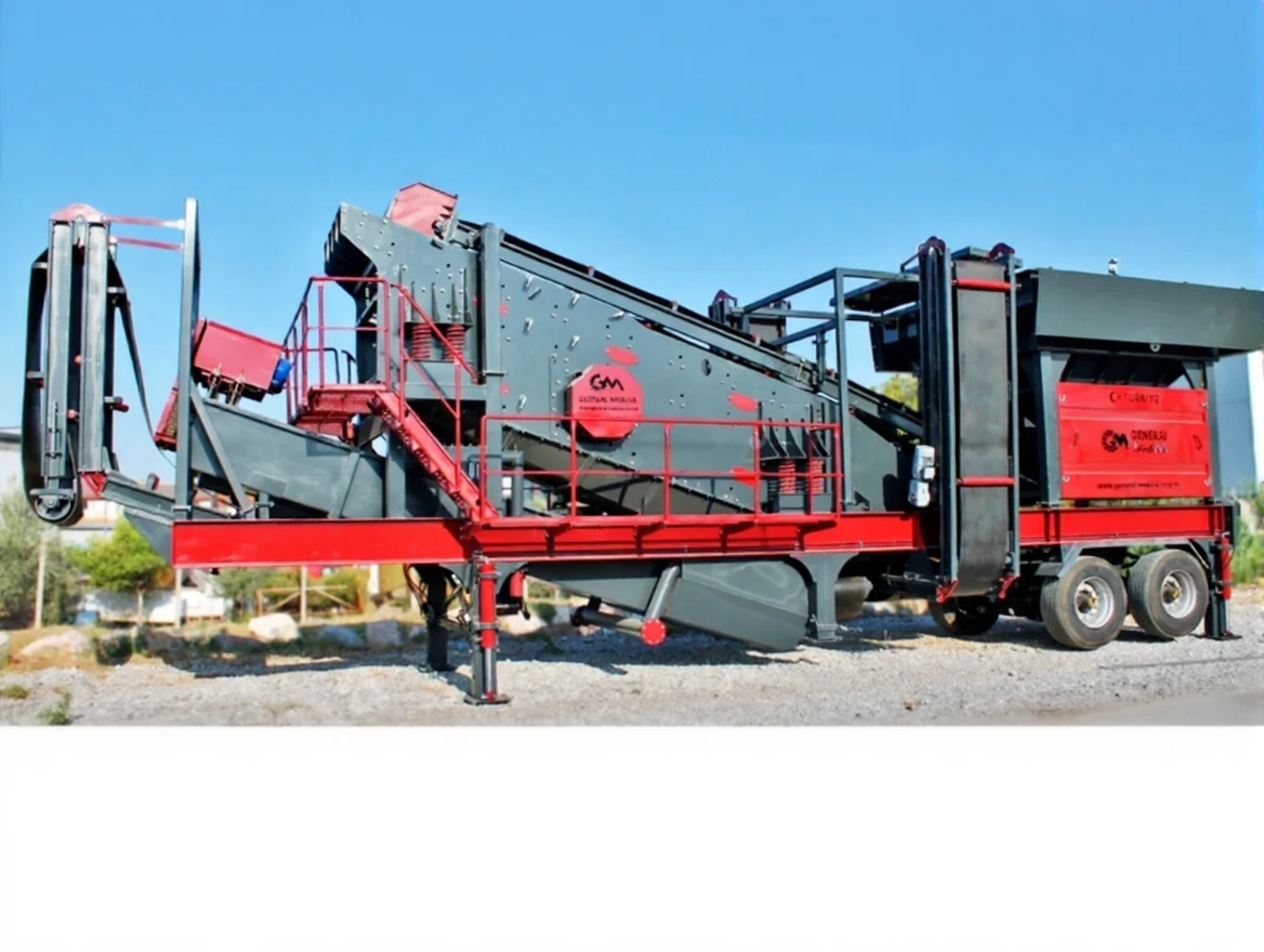 GNR YM1240 type mobile washing and screening units are used in sand screening for stream and mountain sand from 40 tons/hour capacity to 300 tons/hour capacity. The material loaded into the hopper with the bucket is carried to the screen by the belt and the screened material is separated and poured into the stock areas from the by-product belts. In places where there is no power line, it can also operate with the help of a generator mounted on the unit.