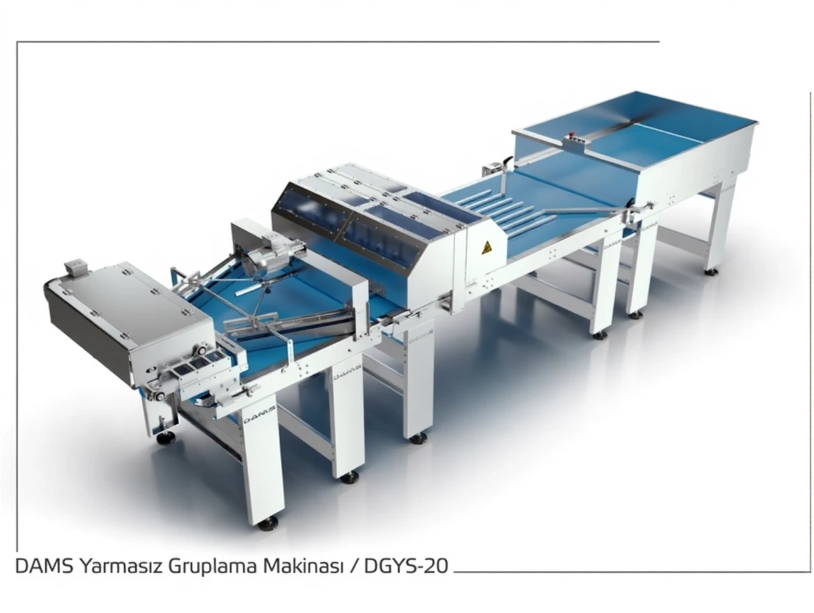 DAMS DYGM-20 is an industrial machine developed for grouping and splitting sandwich and hamburger breads before packaging. It stands out with its user-friendly design, high efficiency, and safety.