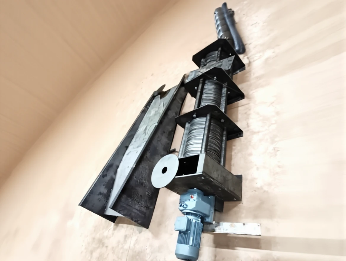 The pressed solid materials are pushed by the screw to be transported to the storage location.