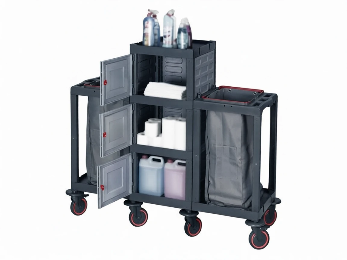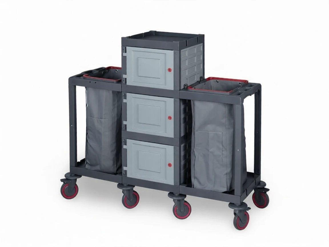 Its ergonomic design provides easy maneuverability for the user while helping you organize your cleaning materials in an orderly manner with its large carrying capacity. It is an excellent solution for hotels, hospitals, shopping malls, offices, factories, and industrial cleaning areas.