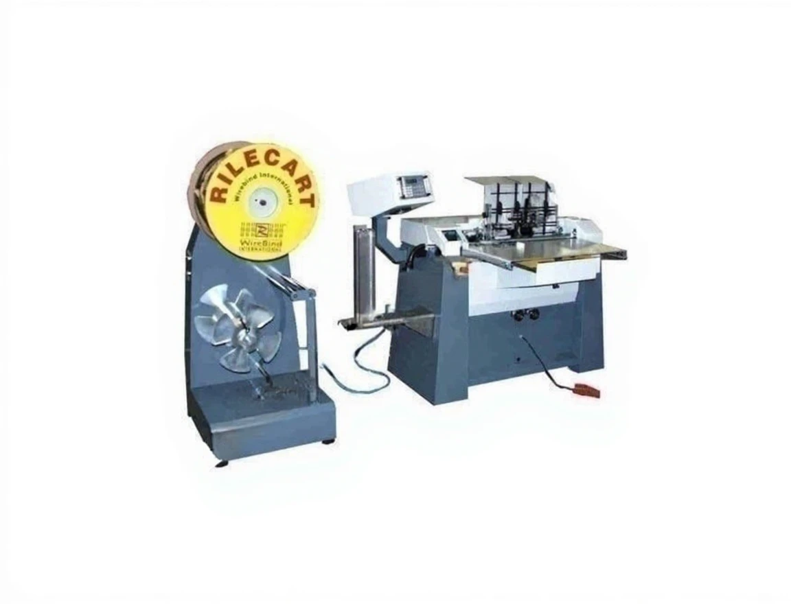 The desired size and number of tabs are loaded into the computer by the operator: The machine automatically unwinds the coil, counts and cuts the spirals, and sends them to the binding place. Here, the operator places the pre-punched paper stack against the back support on the machine table. The open ends of the spiral wires automatically face the punchers. The binding process is completed by pressing the foot pedal. If a hanging calendar is being made, the hanging wire is also automatically mounted. The operator manually takes the bound product from the table and places it on the side table.
