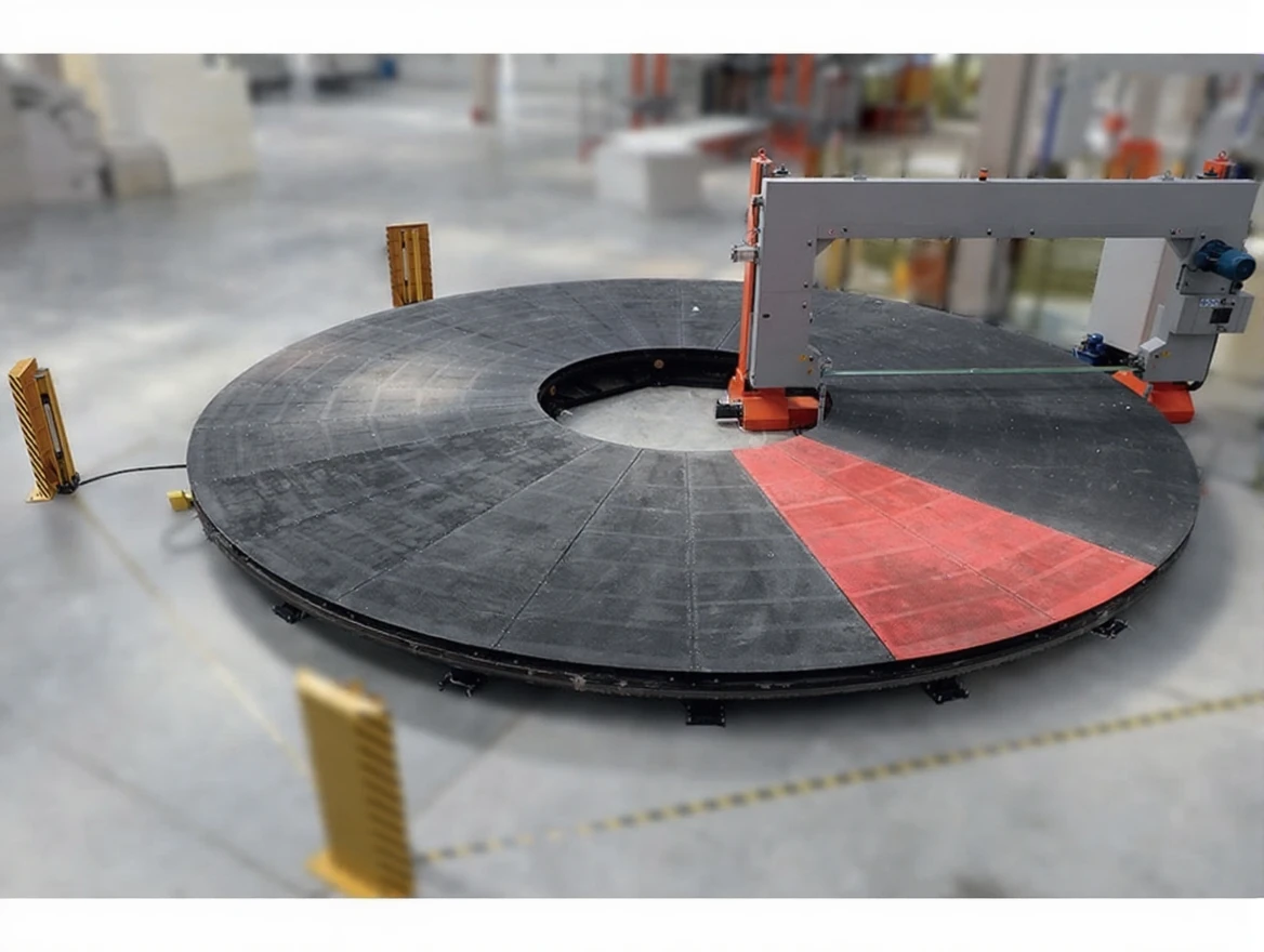 This machine is designed for cutting more than one foam that placed on the circular plate in accordance with the entered thickness value. The operation is fully automatic also it can be intervened manually. During the foam cutting operation not to be moved to impair the quality of the foam, the machine plate is covered with emery stone and high capacity of the vacuum engine is ensured to keep the foam block fixed on the plate.
