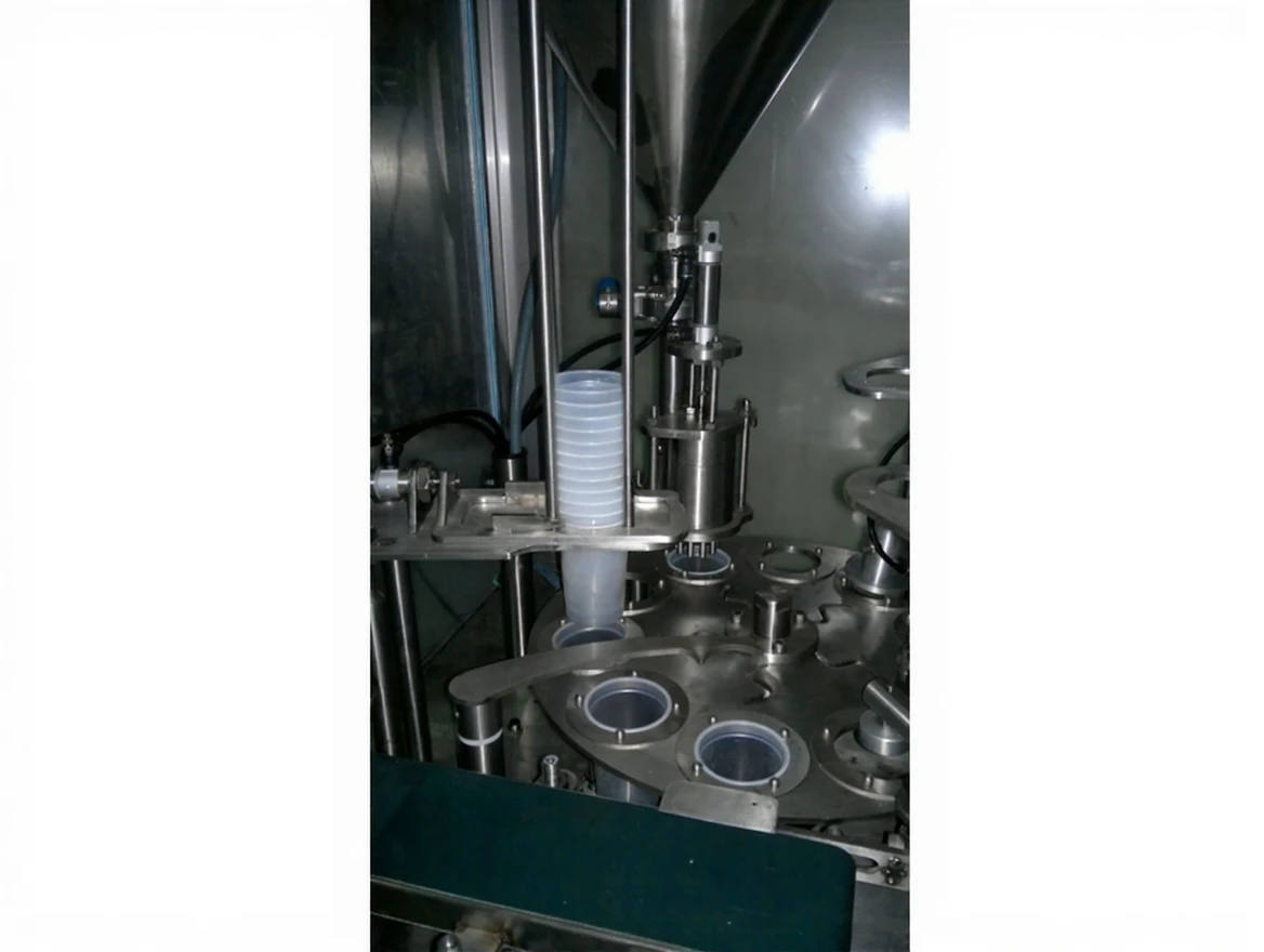 Filling; when the photoelectric control system detects the cup, it automatically fills it with the desired weight, a ready aluminum lid is automatically placed on the cup, and the lids are glued to the rim of the cup under the gluing head.