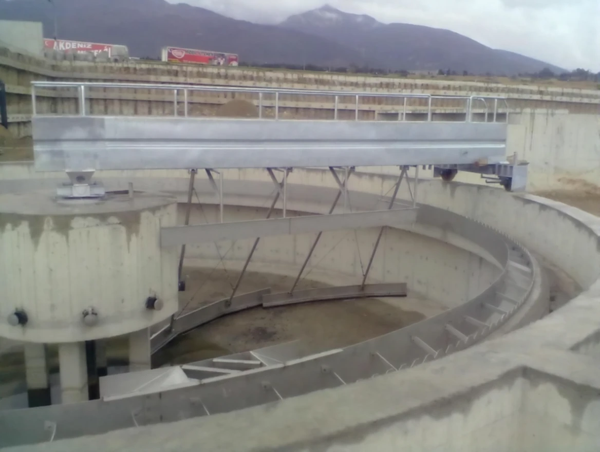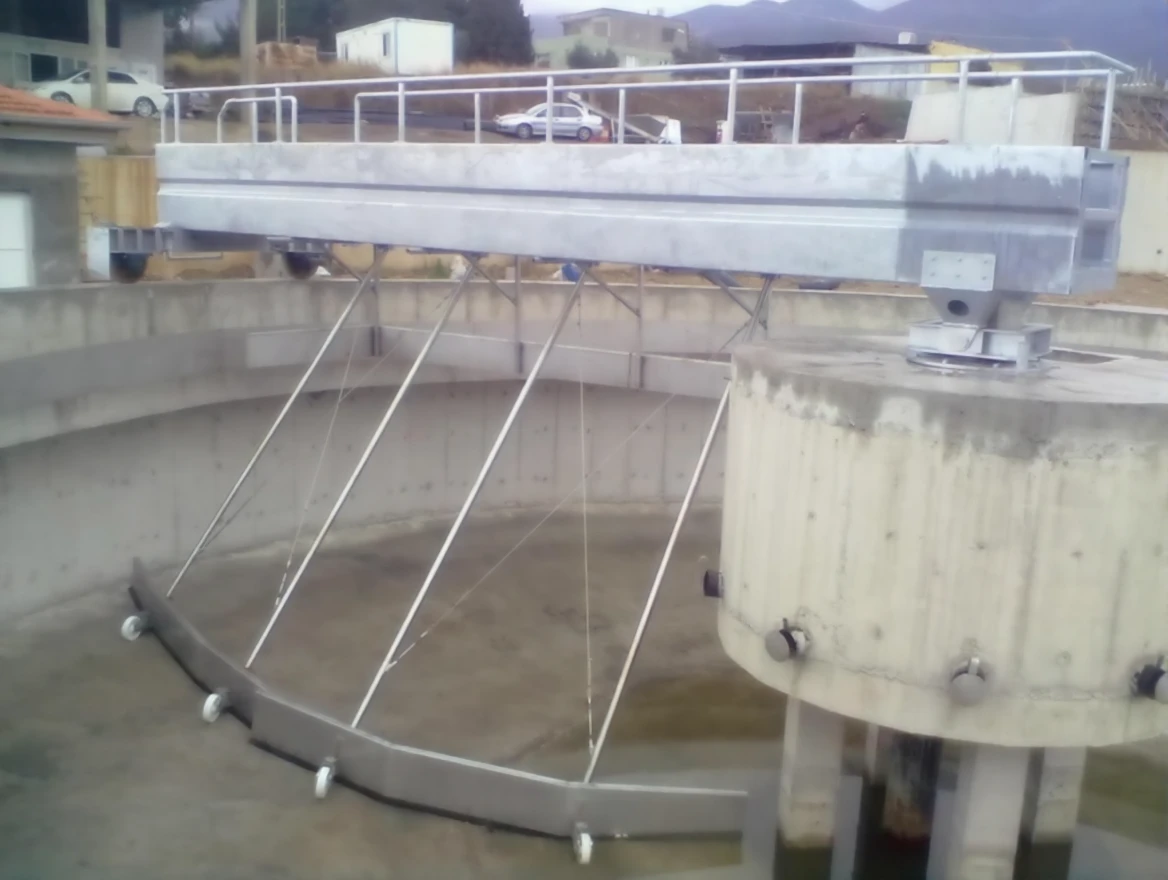 Sludge pool scrapers are used to collect the mud accumulated on the bottom of circular sludge pools in order to collect it into the central collection pit and to remove the foam, oil, and similar substances accumulated on the water surface.