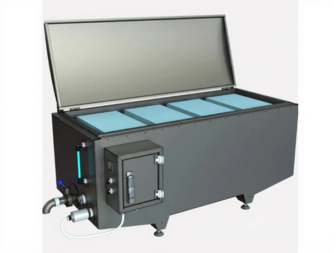 Glass wool insulated rectangular reservoir.